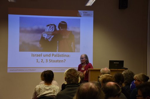 IFSH researcher Dr Margret Johannsen lectures on the Middle East conflict at the "Night of Knowledge" 2017.