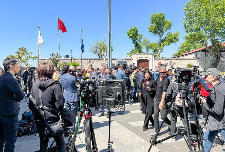 Das Medieninteresse ist groß: Wartende Journalistinnen und Journalisten vor dem Dolmabahce-Palast, wo das Treffen der russischen und ukrainische Delegation stattfinden soll. (c) picture alliance / press.media | Stringer